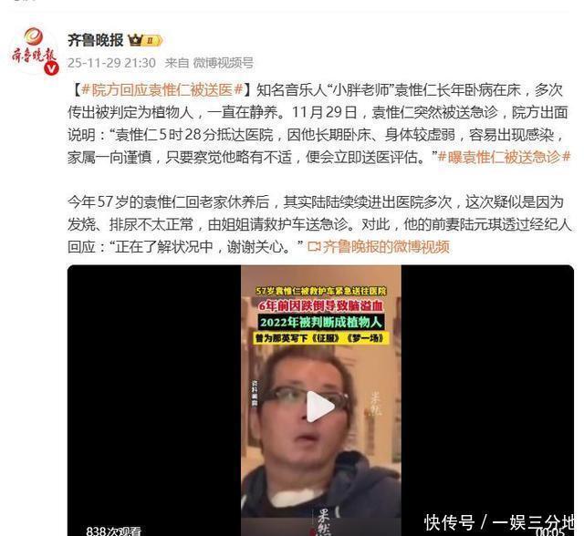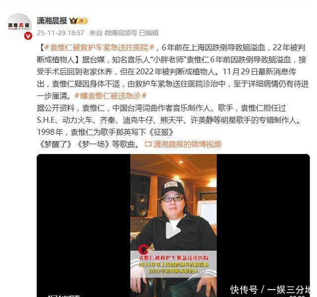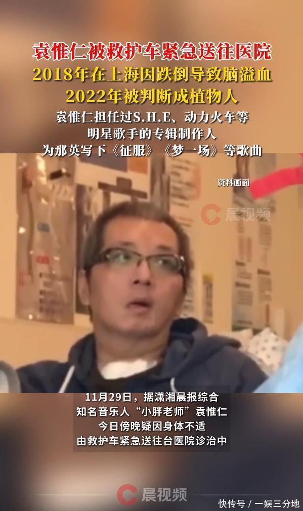 “正在了解状况中”——前妻陆元琪透过经纪人的这短短一句话,让“小胖老师”袁惟仁再度被推上风口浪尖。11月29日傍晚,这位曾创作《征服》《梦一场》等金曲的知名音乐人,因突发高烧与排尿困难,被姐姐紧急呼叫救护车送医。消息一出,瞬间牵动两岸乐迷的神经。